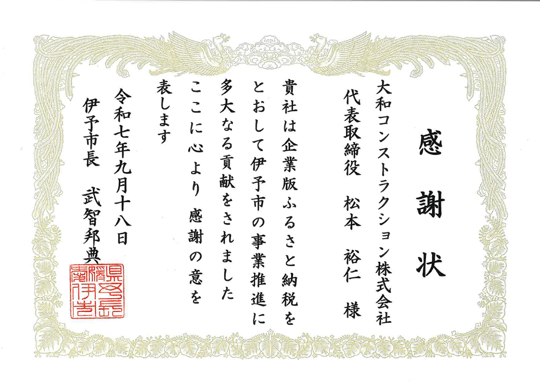 大和コンストラクション株式会社は、伊予市で取り組まれている「柑橘ハウス老朽化対策支援事業」を、ふるさと納税を通じて支援させていただきました。